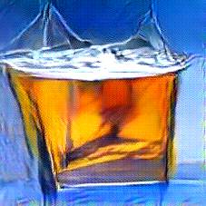 This class was learned from 138 images of Whiskey. The visualizations below show the maximally activated representations of what makes Whiskey look like Whiskey. Each image begins with a randomly-seeded noise image, which leads to a slightly different class representation. Below are 12 activations created from 12 random noise images.