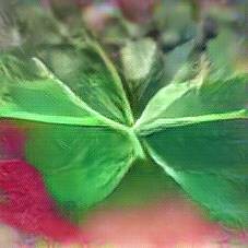 Below are 40 iterations of showing how the neural model learned to represent this class. The visualizations below show the maximally activated representations of what makes Four Leafed Clover look like Four Leafed Clover
